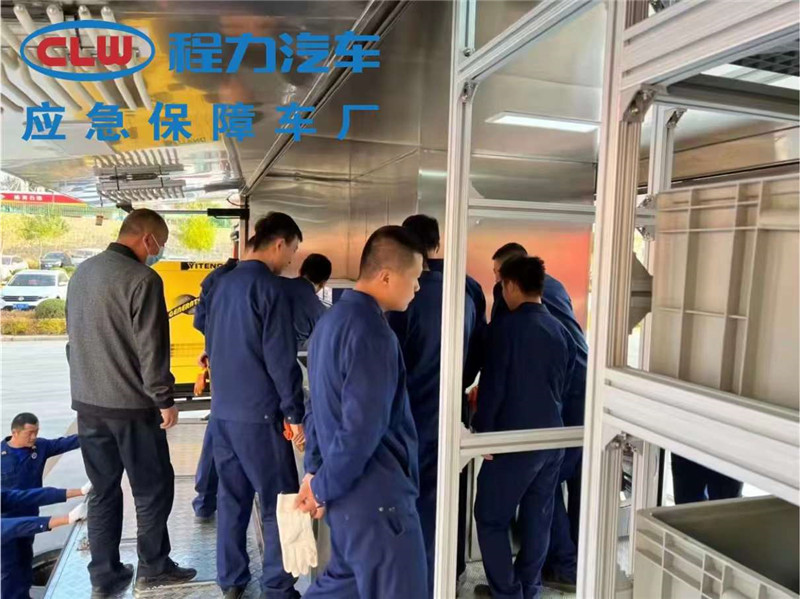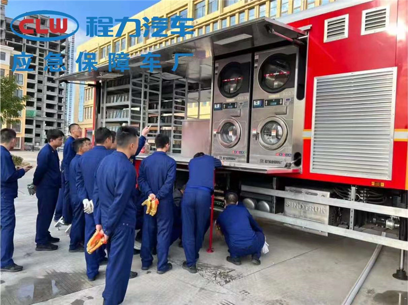 重汽豪沃可移動被服洗滌車,可滿足消防士兵50KG洗衣量同時帶烘干功能, 帶發電機可供洗衣機和烘干機同時工作,并配備有鋁型材置物架放置清洗干凈后的衣服,適用于野外戰訓和消防救援等武警官兵后勤保障服務。
