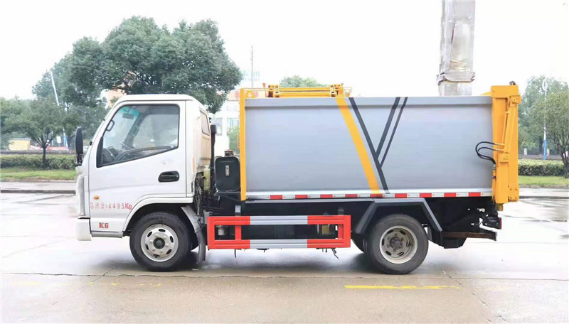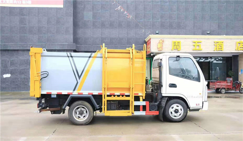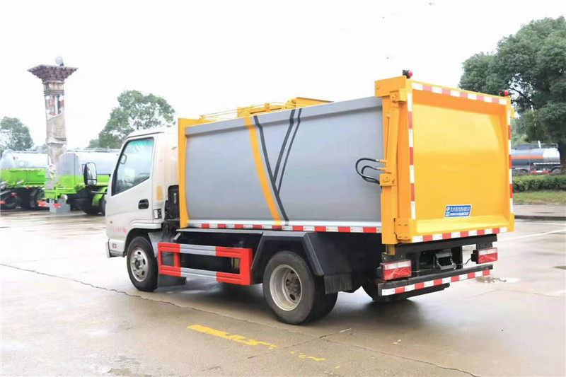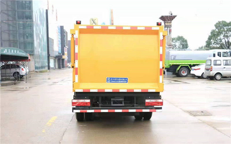 上裝配置:箱體有效容積5立方,內部帶推鏟,后門液壓鎖緊和開啟方式,側部拉桿式提升機,可掛240L標準垃圾桶,頂部投料口帶密封蓋,液壓部分采用揚州中梅多路閥,合肥長源油泵,液壓油管采用高壓鍍金管,帶污水收集箱。